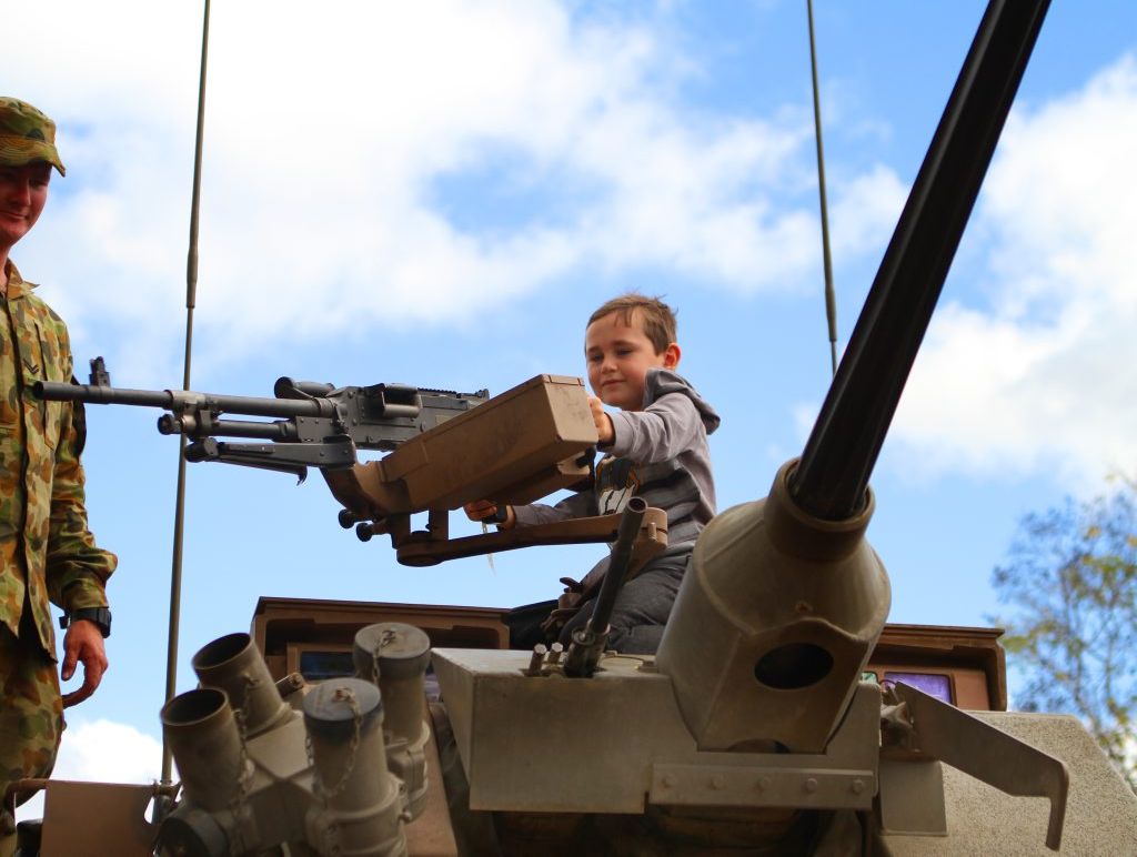 Tucker Boulton was photographed (see left) at the helm of a military weapon at the Talisman Saber open day.