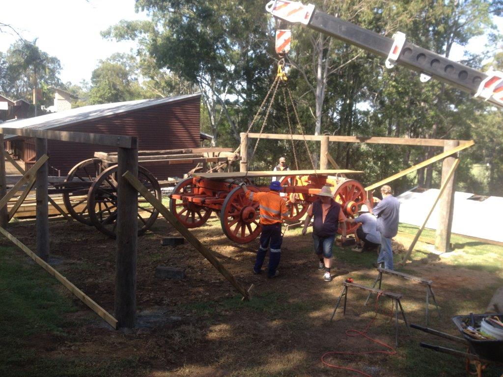 The new wagon shed at the Woodworks Museum had the roof lifted on by crane Wednesday 3rd June.